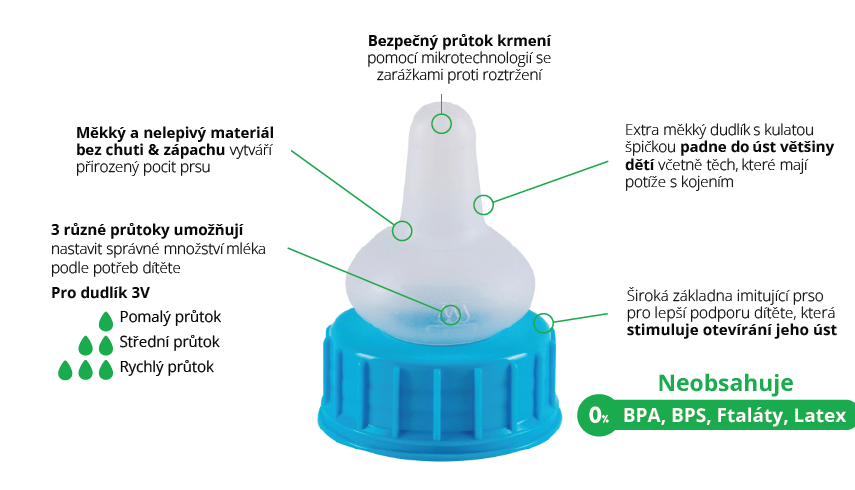 Klíčovou vlastností je 3-rychlostní dudlík, který zaručuje správné proudění pro různé potřeby sání dítěte.