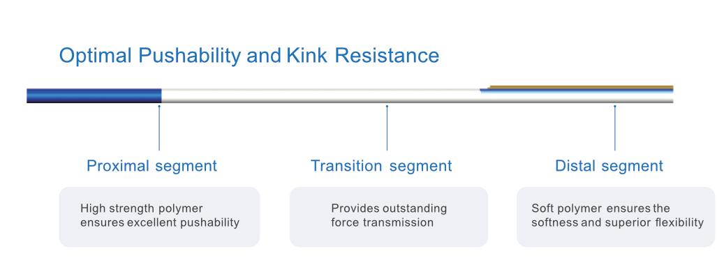Speciální konstrukce dříku: Navržena pro kombinaci flexibility a dostatečné tuhosti, což umožňuje přesné zavedení katetru k místu okluze, a to i v tortuózních a náročných cévních anatomiích.