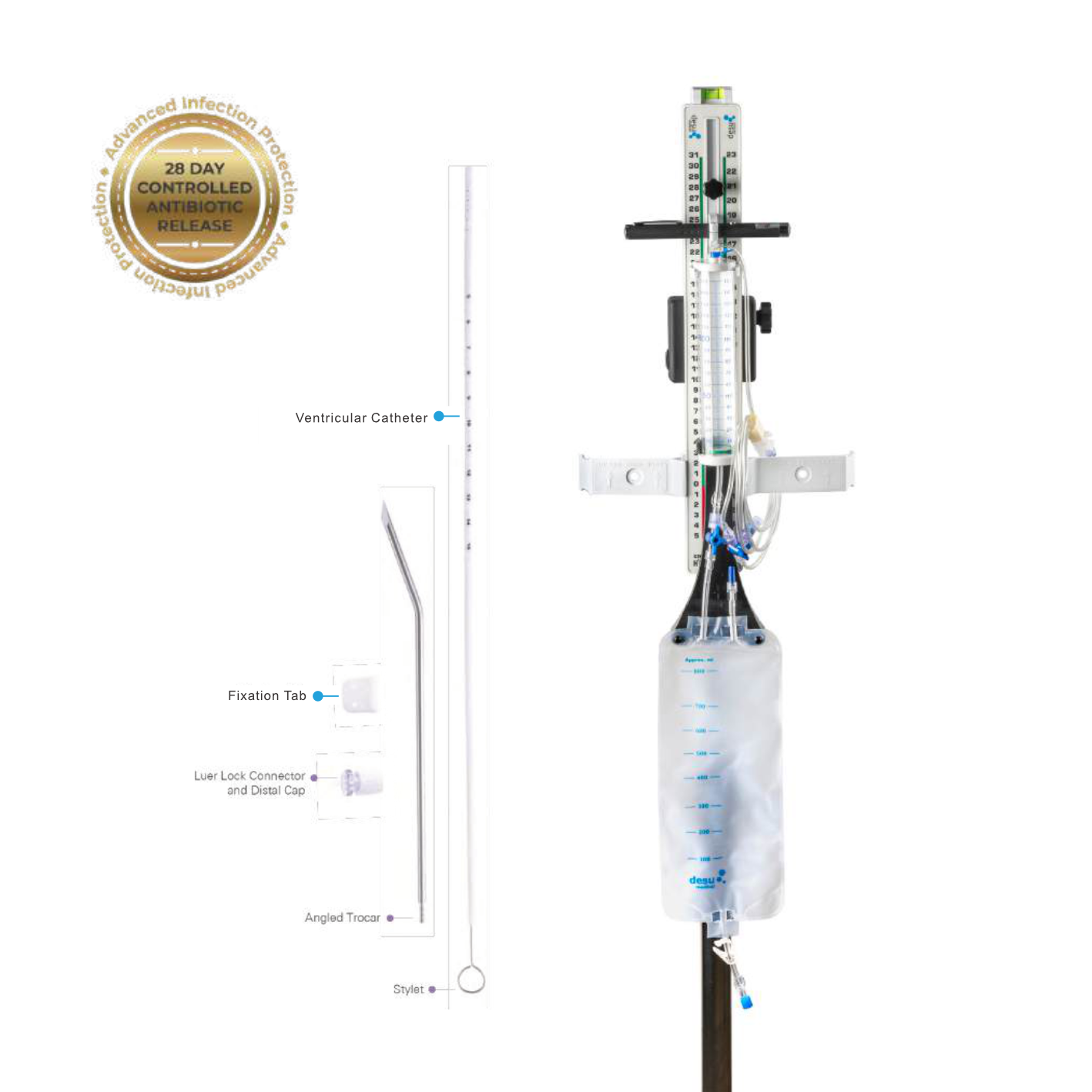 Určeno pro bezpečný odvod CSF a přesné řízení intrakraniálního tlaku u pacientů s akutní hydrocefalem nebo zvýšeným ICP.