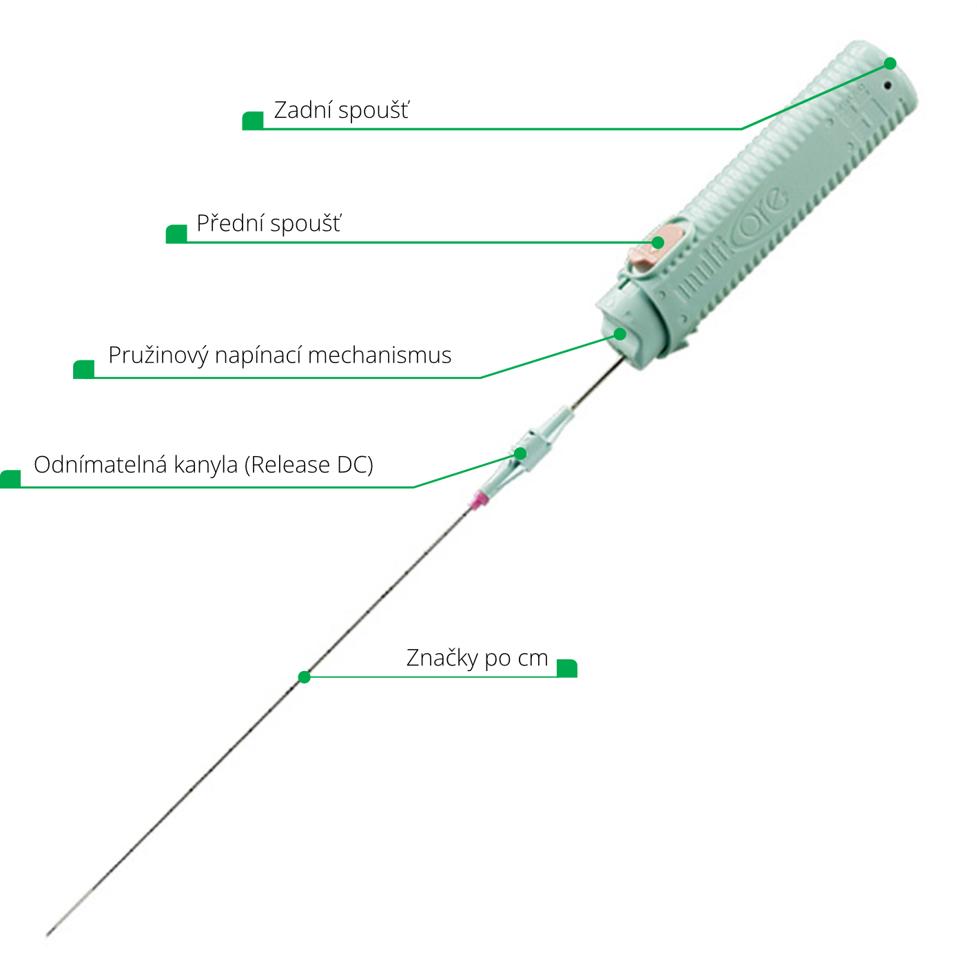 Jednorázové biopsické zařízení MULTICORE® je určeno pro odběr vzorků měkkých tkání s vysokou přesností a minimálním posunem tkáně. Umožňuje snadné ovládání jednou rukou a je ideální pro zákroky s ultrazvukovým naváděním.