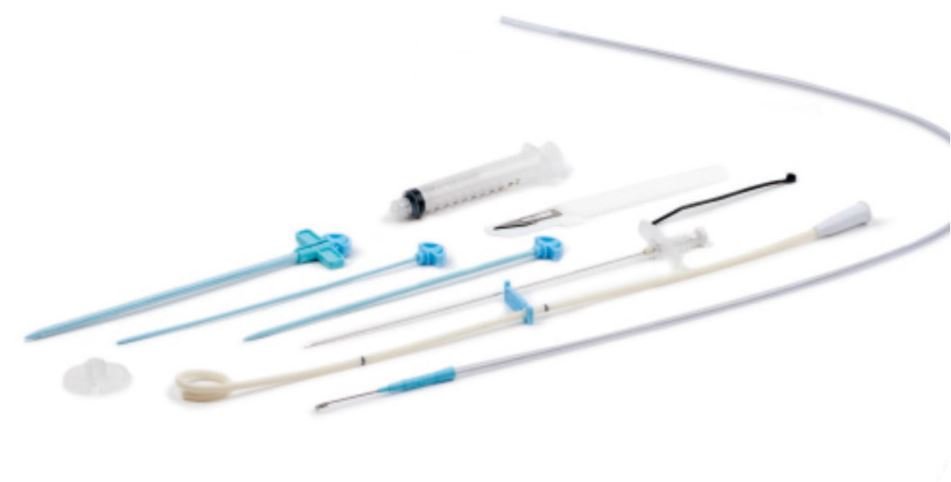 Obsah: Sada obvykle obsahuje katétr, vodící drát, dilatátory, jehlu a fixační pomůcky.