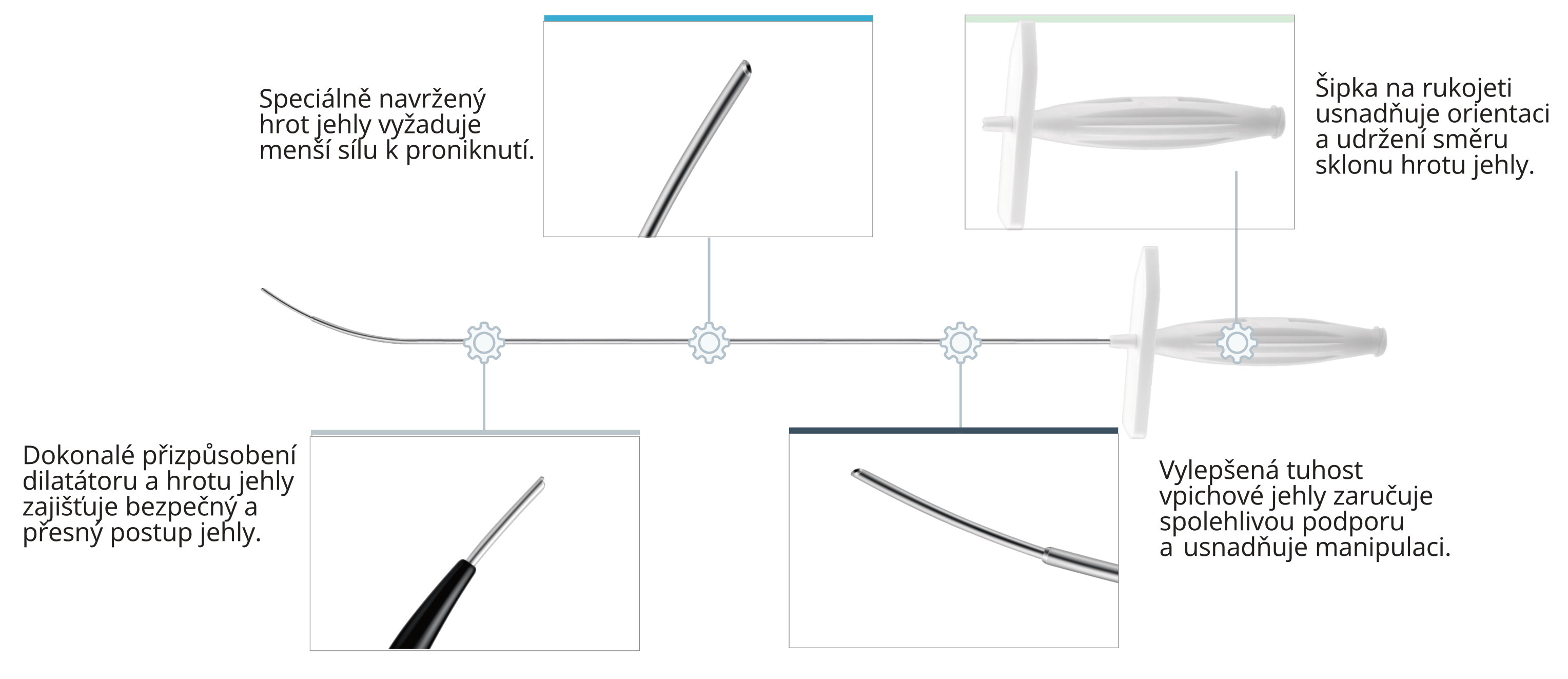 Dokonalé přizpůsobení dilatátoru a hrotu jehly zajišťuje bezpečný, kontrolovaný a přesný postup při výkonu.