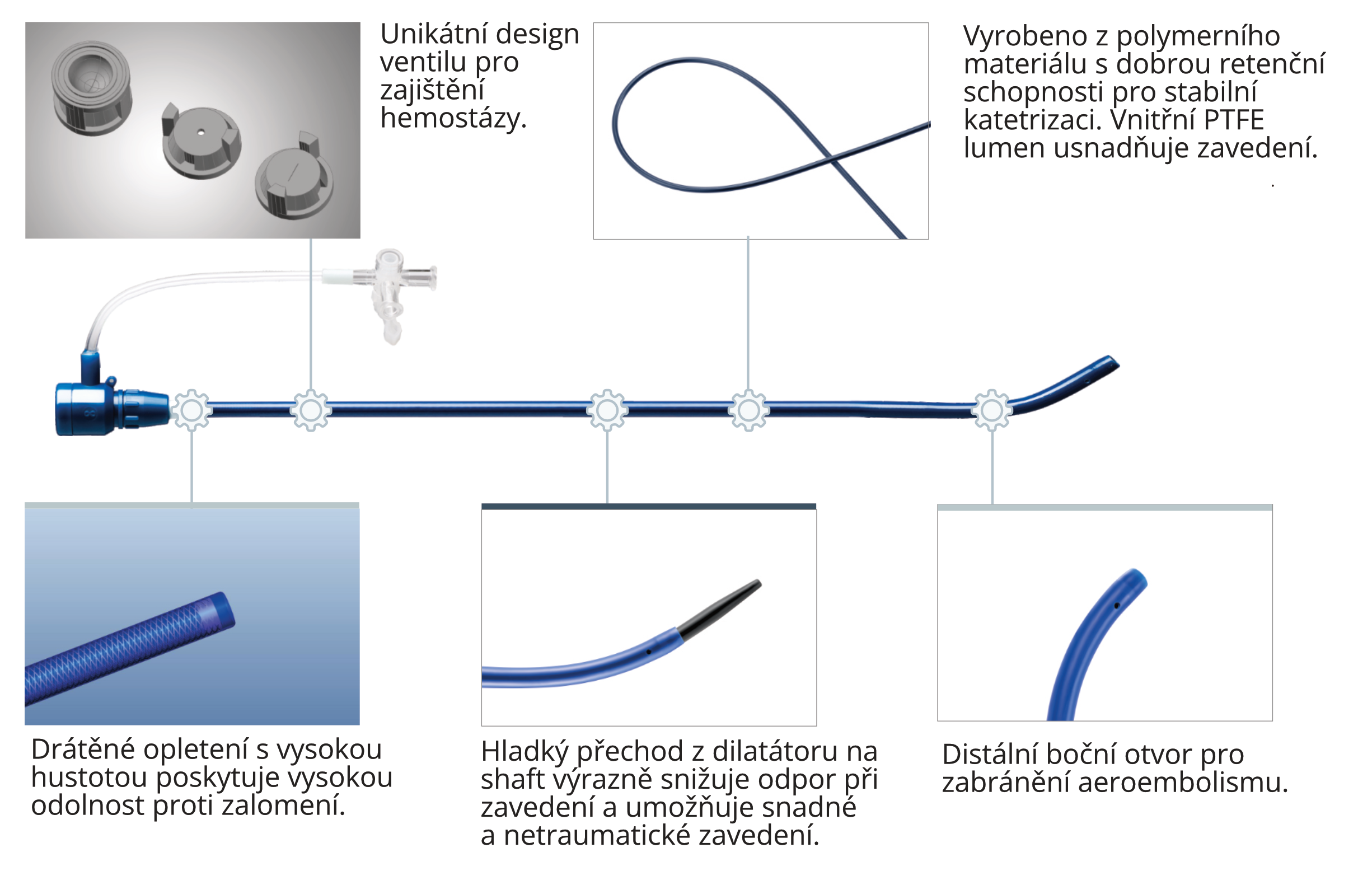 Vnitřní PTFE vrstva sheathu umožňuje velmi hladký průchod a precizní manipulaci.