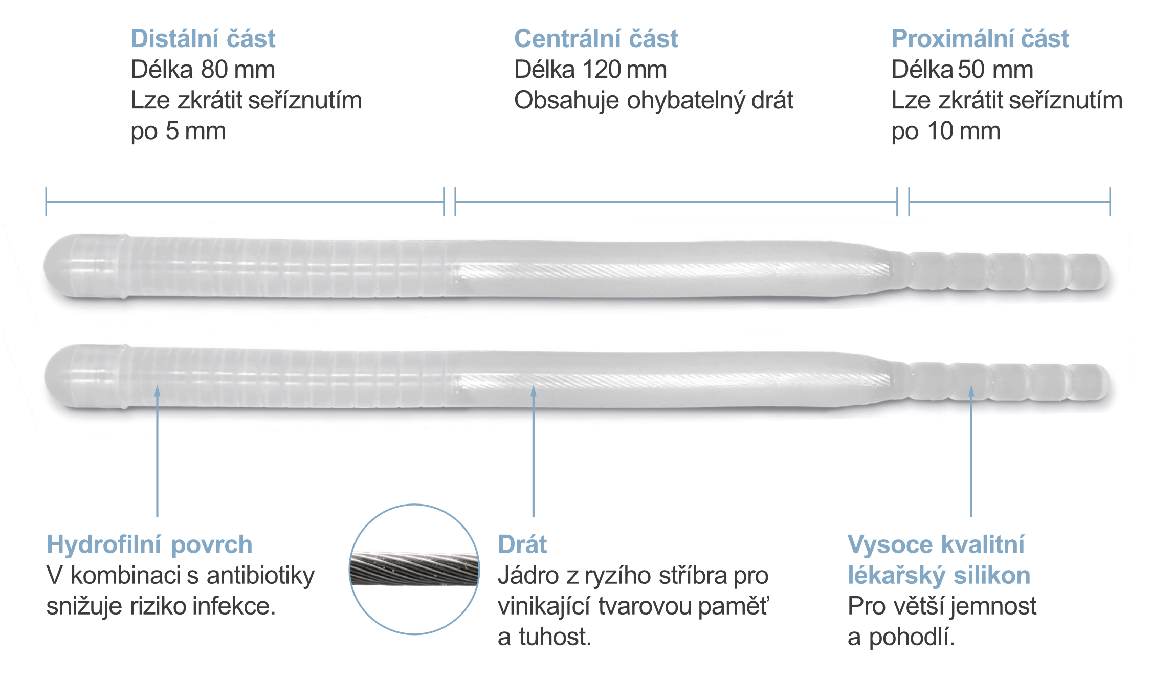 Centrální část (120 mm) – obsahuje ohybatelný drát, který dává implantátu tvarovou paměť a stabilitu.
